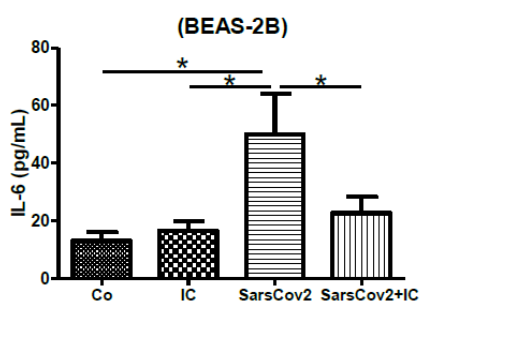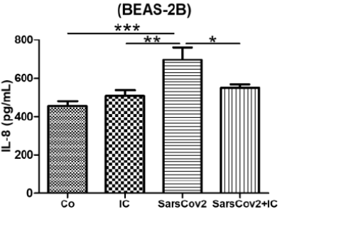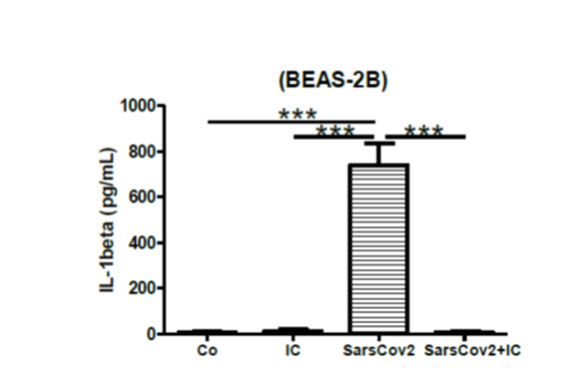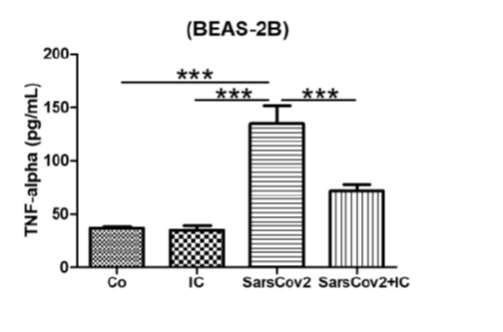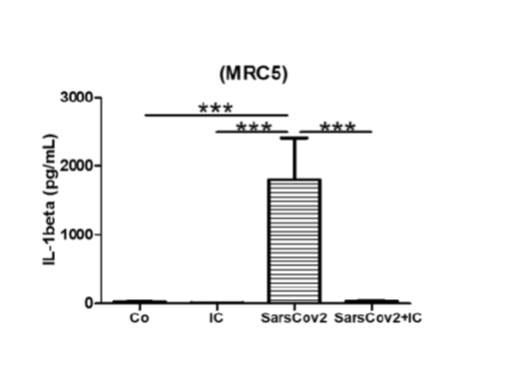 The experiments were done using two cells which have a central role in the physiopathology of COVID-19, BEAS-2B cells (bronchial epithelial cells) and MRC-5 cells (lung fibroblast cells), which were stimulated by whole blood cells from COVID-19 patient with viral load ranging CT 15-18, obtained from acute phase of disease (maximum of 24 hours of hospitalization). In summary, 5x104 BEAS-2B cells and 1x104 MRC-5 cells were cultivated in 2 ml of freshwhole blood of COVID- 19 patient, for an initial incubation with 50ul of VIRLAZA for 1 hour, followed by an additional period of incubation of 3 hours, into a CO2 incubator, with 5%CO2 and 37ºC degrees. After 4 hours of incubation, the cells were harvested and centrifuged at 900g at 4º degrees, for 7 minutes. The supernatant was used for measurement of pro-inflammatory cytokines (IL-1beta, IL-6, IL-8 and TNF-alpha), which are key cytokines for COVID-19 physiopathology, progression and severity, as well as of anti-inflammatory cytokines (IL-1RA and IL-10).